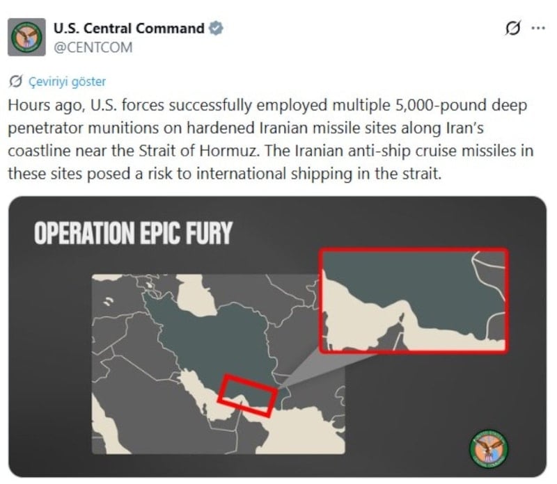CENTCOM’un sosyal medya üzerinden yaptığı açıklamada, ABD güçlerinin Hürmüz Boğazı yakınlarındaki İran kıyı şeridinde yer alan füze üslerini hedef aldığı ifade edildi.