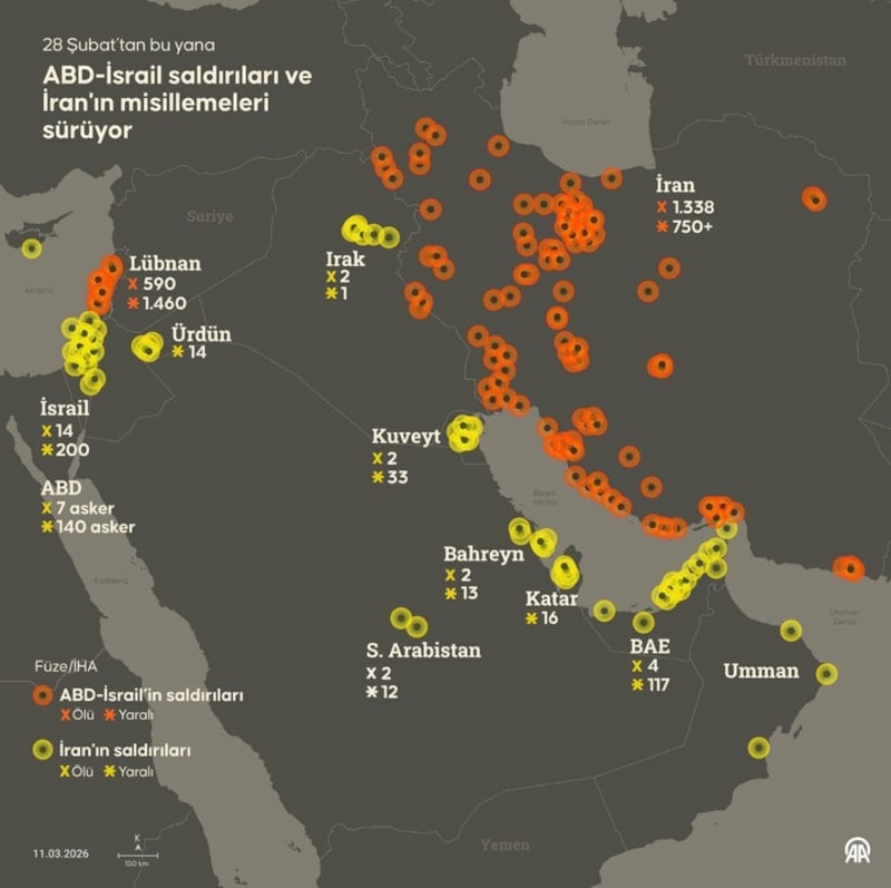 Savaşın merkezi İran, en ağır kaybı veren ülke konumunda. İran Kızılayı’na göre, savaşın başından bu yana en az 1.338 kişi yaşamını yitirdi. Bu rakama İran Devrim Muhafızları ve Silahlı Kuvvetler’in kayıpları dahil değil.