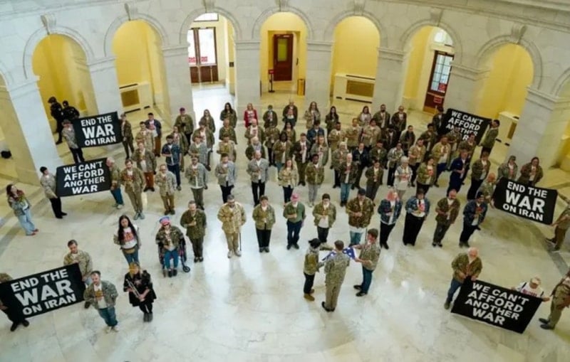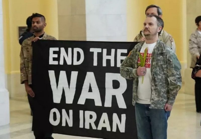 Göstericiler, Kongre binasının “Cannon Rotunda” olarak bilinen ana salonunda bir araya gelerek İran’a yönelik askeri adımlara karşı tepkilerini dile getirdi. ABD askeri üniforması giyen protestocular, taşıdıkları dövizlerle mesaj verdi.