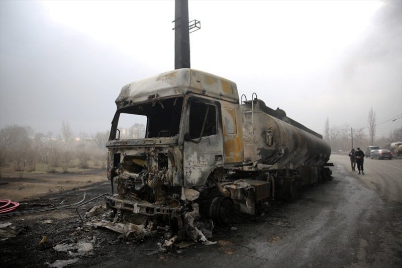 Petrol deposunda saldırı sonrası çıkan yangın devam ederken, bölgede bulunan çok sayıda tanker ve araç kullanılamaz hale geldi.