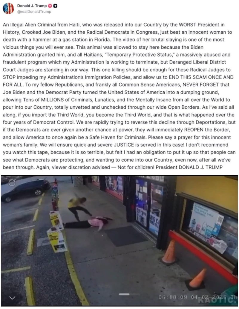 ABD’de yaşanan bir şiddet olayını hatırlatan Trump, “Tarihteki en kötü başkan olan sahtekar Joe Biden ve ABD Kongresi’ndeki radikal Demokratlar tarafından ülkemize salıverilen Haitili yasa dışı göçmen bir suçlu, Florida’daki bir benzin istasyonunda masum bir kadını çekiçle döverek öldürdü. Onun vahşice katledilişinin videosu, görebileceğiniz en gaddarca şeylerden biri” ifadelerini kullandı.
