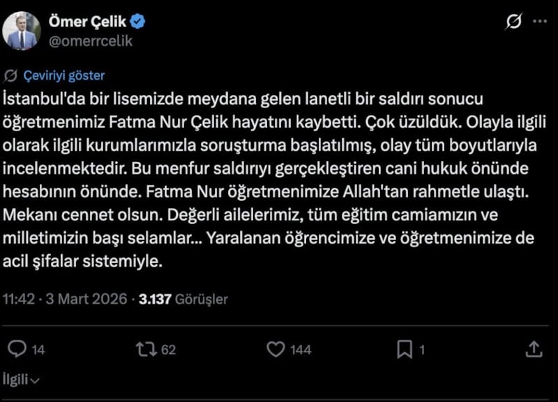 İstanbul’da bir lisemizde gerçekleşen lanetli bir saldırı sonucu öğretmenimiz Fatma Nur Çelik hayatını kaybetti. Çok üzgünüz.