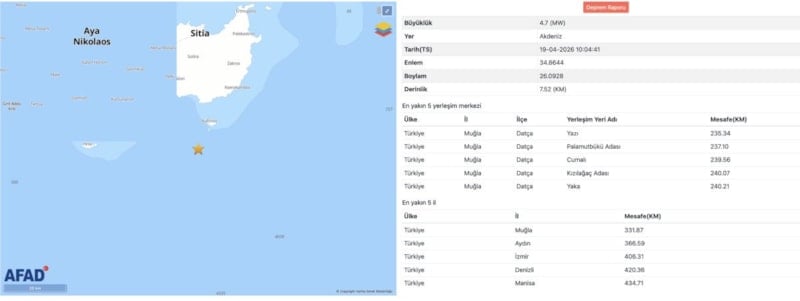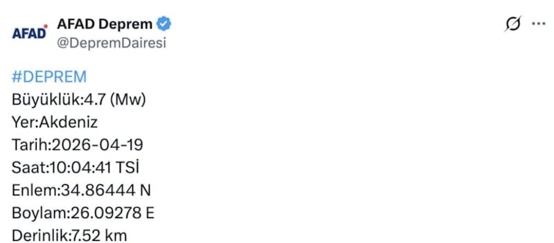 Afet ve Acil Durum Yönetimi Başkanlığı’nın (AFAD) internet sitesinde yer alan bilgiye göre, Akdeniz açıklarında saat 10.04’te 4.7 büyüklüğünde sarsıntı kaydedildi.