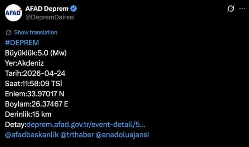 Akdeniz’de 5.0 büyüklüğünde bir deprem meydana geldi.