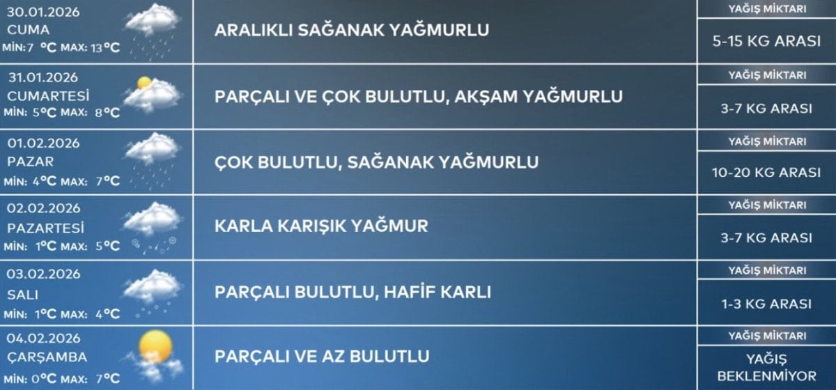 En düşük ve en yüksek hava sıcaklıklarının, aralıklı sağanak görülecek yarın 7-13, parçalı ve çok bulutlu, akşam yağmurlu geçecek 31 Ocak Cumartesi 5-8, çok bulutlu, sağanak yağmurlu geçecek 1 Şubat Pazar ise 4-7 derece olacağı tahmin ediliyor.