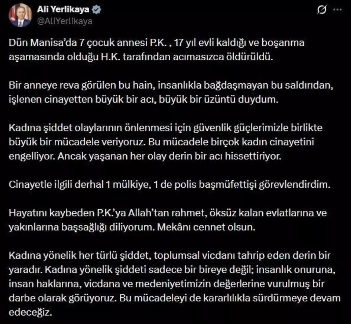 İçişleri Bakanı Ali Yerlikaya, Manisa’da 7 çocuk annesi kadının eşi tarafından öldürülmesine ilişkin, sosyal medyadan bir açıklama yayınladı.