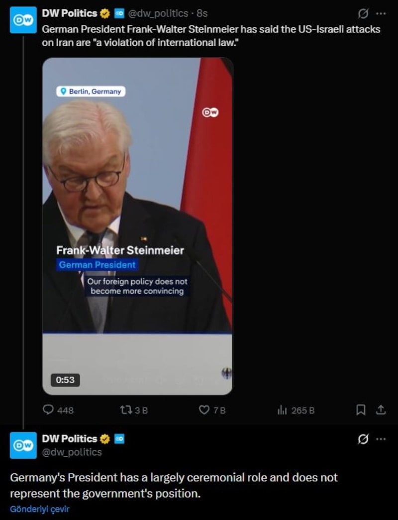 Öte yandan Alman yayın kuruluşu Deutsche Welle (DW), Steinmeier’in açıklamalarını aktarırken, Almanya Cumhurbaşkanlığı makamının büyük ölçüde sembolik olduğuna ve hükümet politikalarını doğrudan temsil etmediğine dikkat çekti.