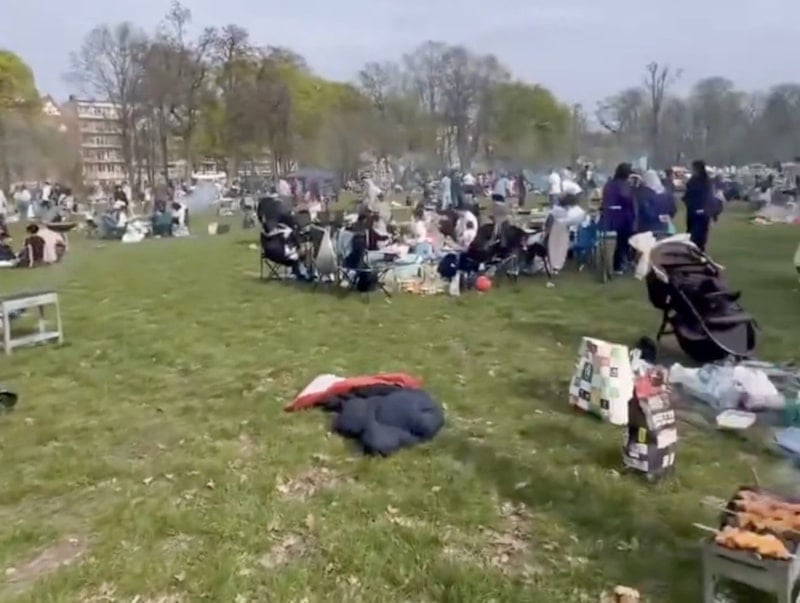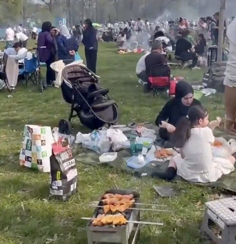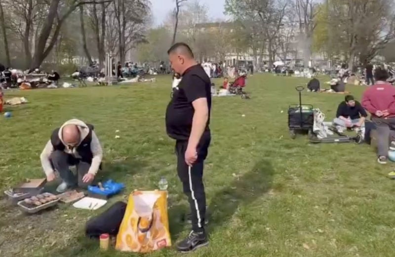 Parkta, piknik yapan, mangal yakan ve kalabalık gruplar halinde vakit geçiren çok sayıda göçmen görüntülere yansıdı.
