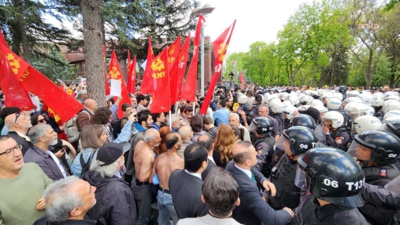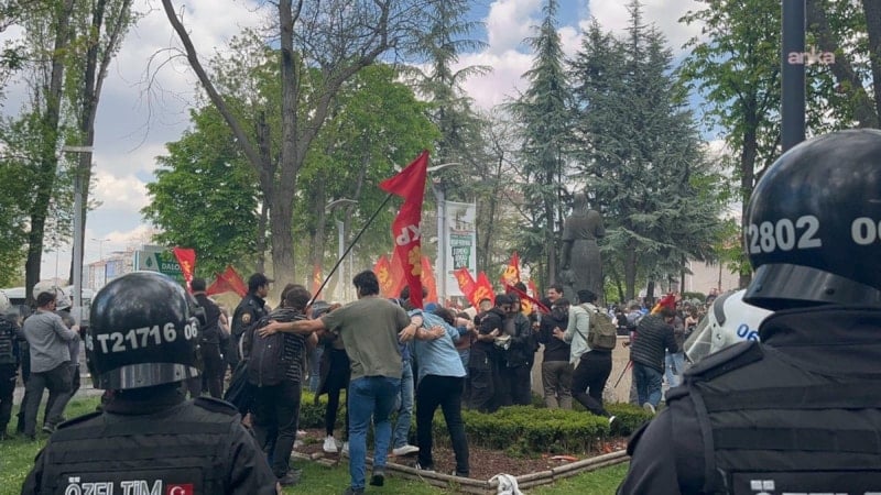 TİP ve Erkan Baş’ın çağrıları ile eyleme gelen kalabalık ile polis arasında zaman zaman gerilim artarken polis ekipleri de eylemciler tarafından hedef alınıyor.