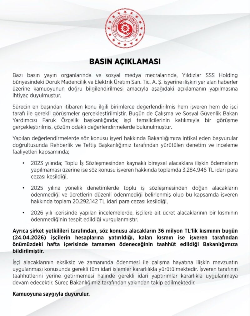 Yapılan değerlendirmelerde söz konusu iş yeri hakkında bakanlığımıza intikal eden başvurular doğrultusunda Rehberlik ve Teftiş Başkanlığımız tarafından yürütülen denetim ve inceleme faaliyetleri kapsamında, 2023 yılında toplu iş sözleşmesinden kaynaklı bireysel alacaklara ilişkin ödemelerin yapılmaması üzerine ise söz konusu işveren hakkında 3 milyon 284 bin 946 lira idari para cezası kesildiği, 2025 yılına yönelik denetimlerde toplu iş sözleşmesinden doğan alacakların ödenmediği ve ücretlerin düzenli ödenmediği belirlenmiş olup bu kapsamda işveren hakkında 20 milyon 292 bin 142 lira idari para cezası kesildiği, 2026 yılı içerisinde yapılan incelemelerde, işçilere ait ücret alacaklarının bir kısmının ödenmediğinin tespit edildiği vurgulanmıştır.
