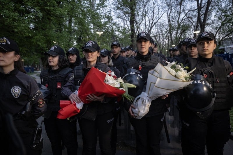 Madenciler, istismar nedeniyle zaman zaman gerilim yaşadıkları polise de alandan ayrılmadan önce çiçek takdim etti.