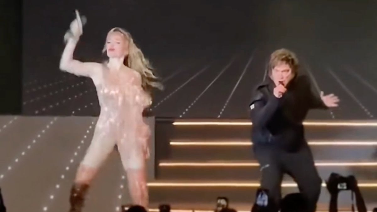 Burada sahneye çıkan Milei, Florez’in eşliğine şarkı söyledi.