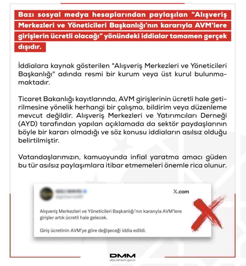 Dezenformasyonla Mücadele Merkezi, “AVM’lere girişlerin ücretli olacağı” iddiasının gerçek dışı olduğunu bildirdi.