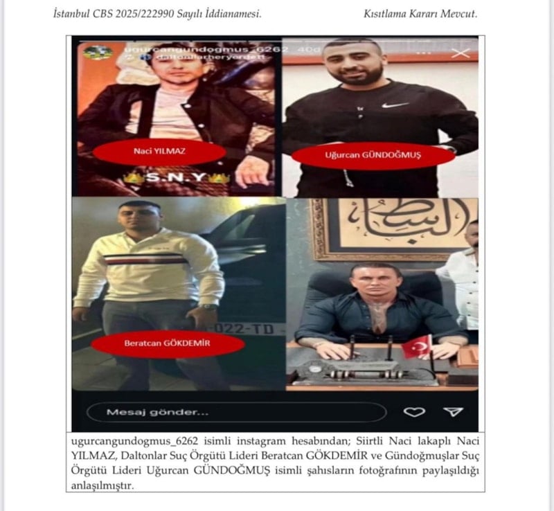 Bu paylaşımlarda, İspanya’da öldürülen Daltonlar yöneticisi Caner Koçer’in intikamının alındığı ileri sürüldü. İddianamede, sosyal medyada yapılan “Daltonlar vurur, Gündoğmuşlar noktayı koyar” şeklindeki paylaşımlara da yer verildi.
