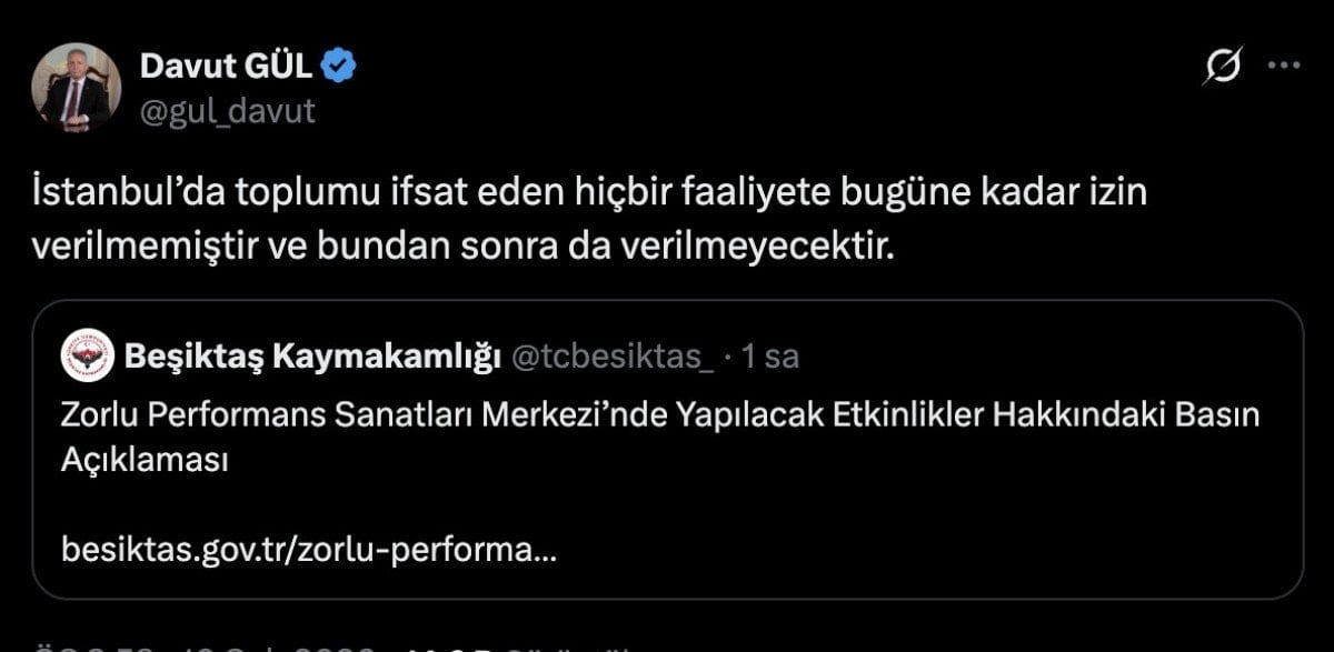 Sosyal medya hesabından yaptığı paylaşımda Beşiktaş Kaymakamlığı’nın açıklamasını alıntılayan Gül, “İstanbul’da toplumu ifsat eden hiçbir faaliyete bugüne kadar izin verilmemiştir ve bundan sonra da verilmeyecektir.” dedi.