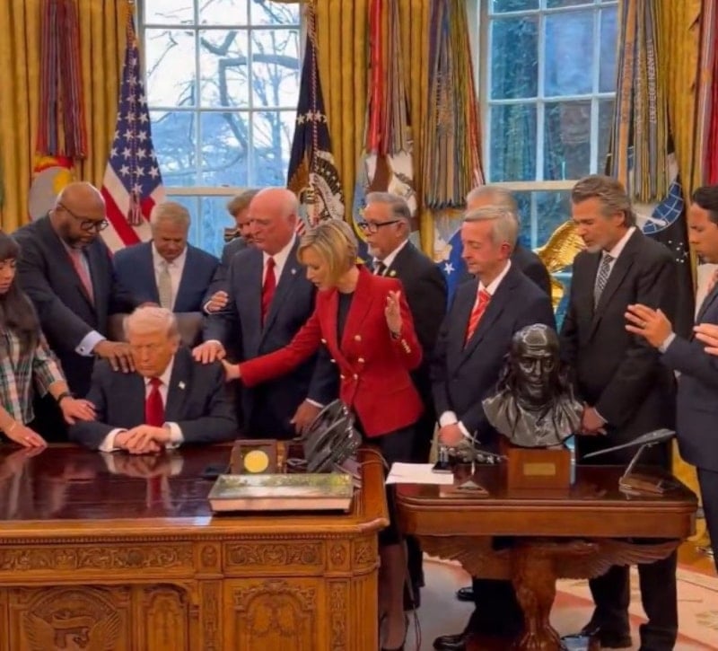 Sosyal medyada ilgi çeken görüntülerde, grubun Trump’ın etrafında kenetlenerek ellerini omuzlarına koyduğu ve başkan için dua ettiği görüldü.
