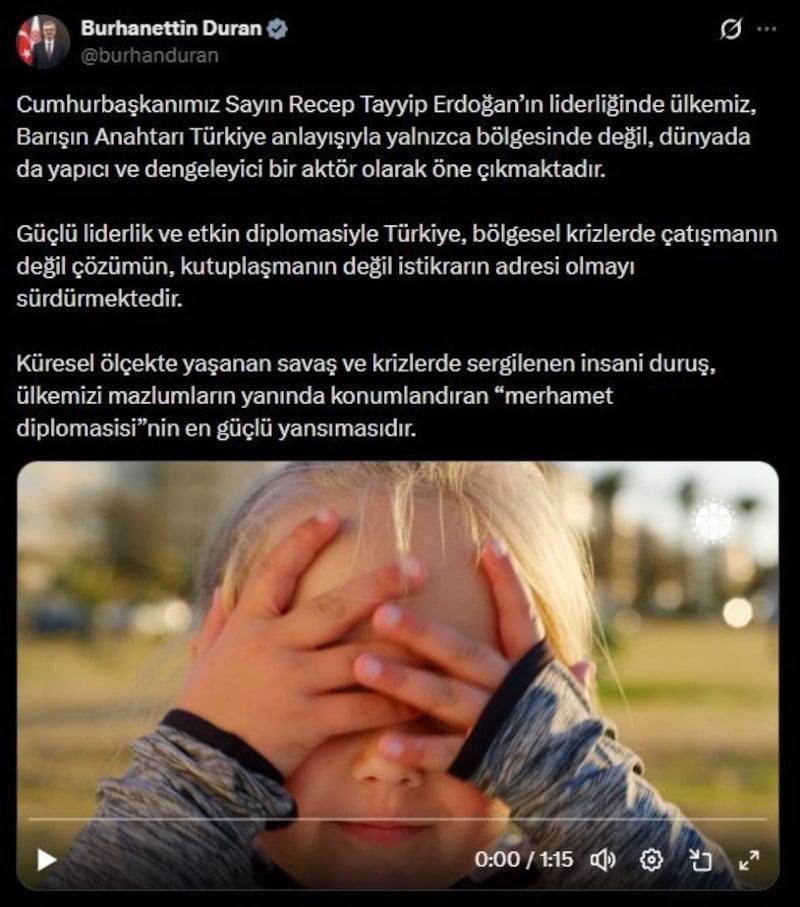 Duran, Türkiye’nin uluslararası arenada sergilediği insani yaklaşımın “merhamet diplomasisinin en güçlü yansıması” olduğunu vurguladı.