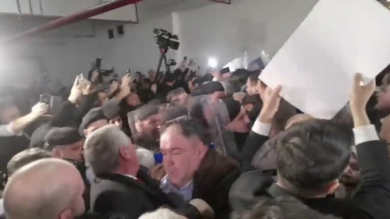 Seçimin yapılacağı meclis salonuna sadece belediye meclis üyelerinin alınmasına izin verilirken, polis ile partililer arasında arbede çıktı.