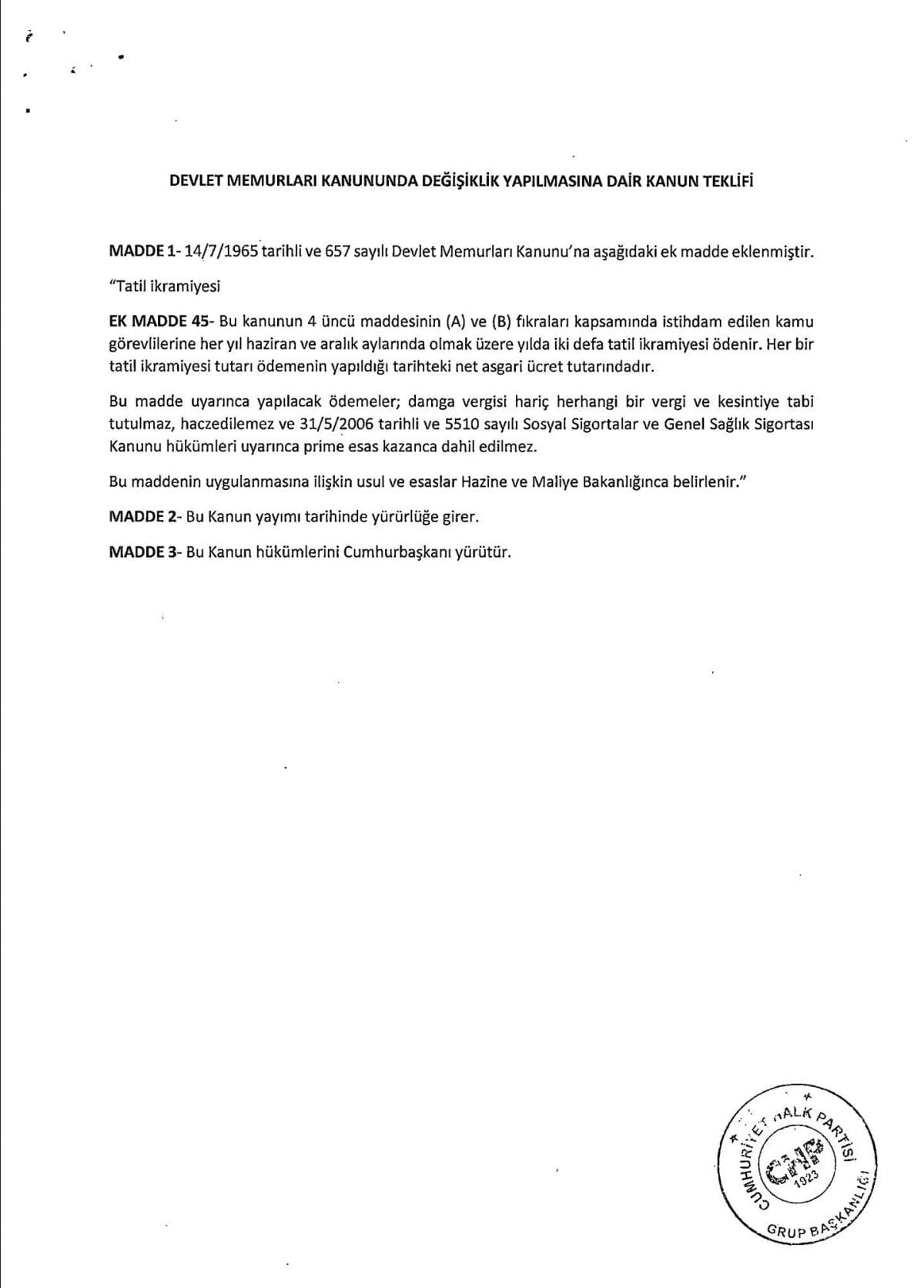 Teklif hayata geçerse memurlara yılda iki kez asgari ücret tutarında ikramiye verilecek.