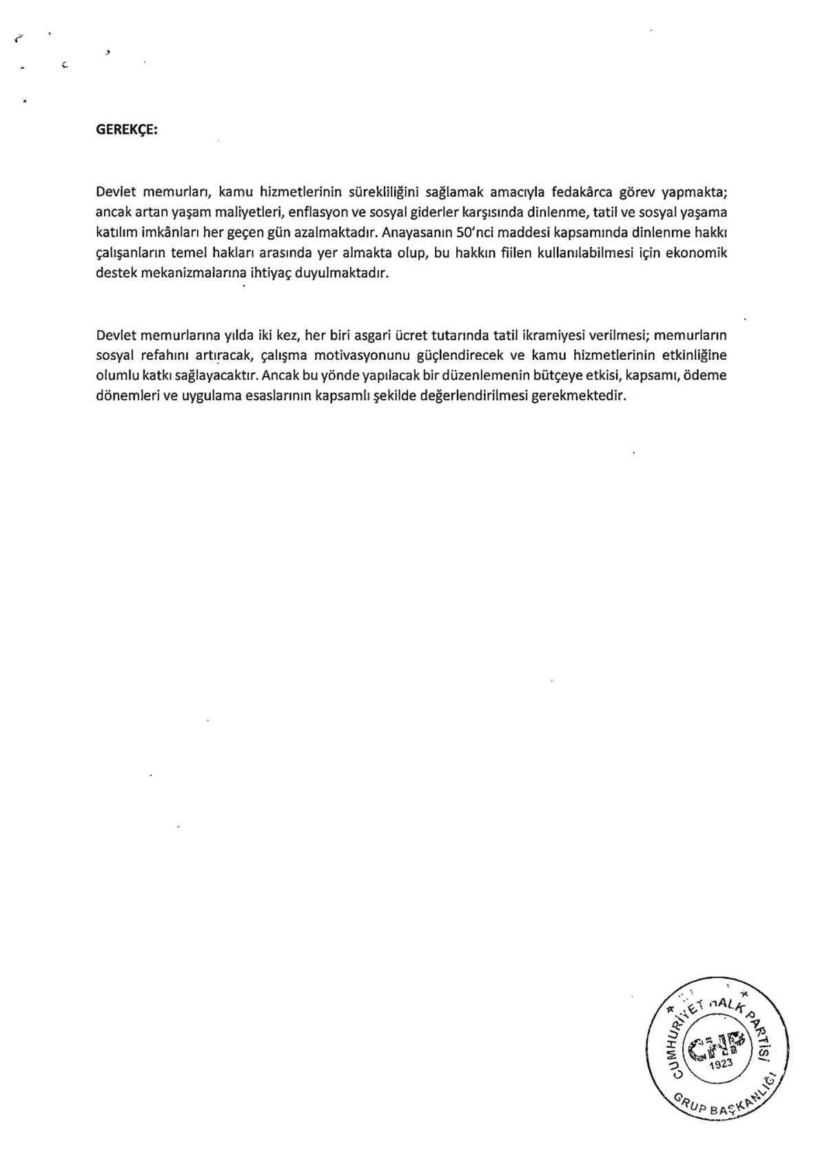 Teklifin gerekçesinde, “Anayasanın 50’nci maddesi kapsamında dinlenme hakkı çalışanların temel hakları arasında yer almakta olup, bu hakkın fiilen kullanılabilmesi için ekonomik destek mekanizmalarına ihtiyaç duyulmaktadır.