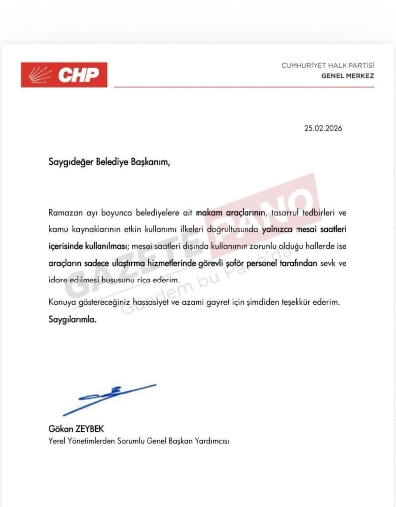 CHP Yerel Yönetimlerden Sorumlu Genel Başkan Yardımcısı Gökan Zeybek, belediye başkanlarına gönderdiği genelgede, Ramazan ayı boyunca belediyelere ait makam araçlarının tasarruf tedbirleri ve kamu kaynaklarının etkin kullanımı ilkeleri doğrultusunda yalnızca mesai saatleri içerisinde kullanılmasını istedi.