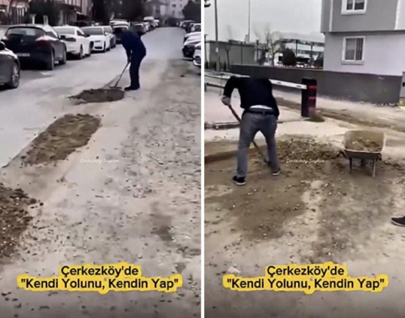 Hizmetten tamamen umudunu kesen esnaf ve mahallelinin, koca belediyenin aylardır görmezden geldiği o devasa çukurları el birliğiyle, kova kova toprak taşıyarak kapatmaya çalıştığı görüldü.