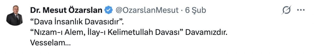 Özarslan paylaşımında “Dava İnsanlık Davasıdır. ‘Nizam-ı Alem, İlay-ı Kelimetullah Davası’ davamızdır. Vesselam…” ifadeleri yer aldı.