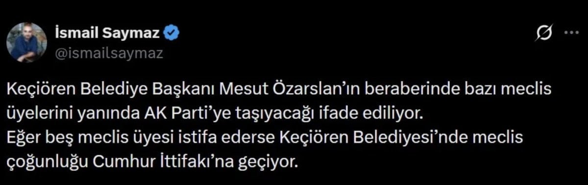 “Keçiören Belediye Başkanı Mesut Özarslan’ı geçen hafta aramış, ‘AK Parti’ye geçecek misiniz?’ diye sormuştum. Özarslan, bu iddiayı yalanlamıştı.