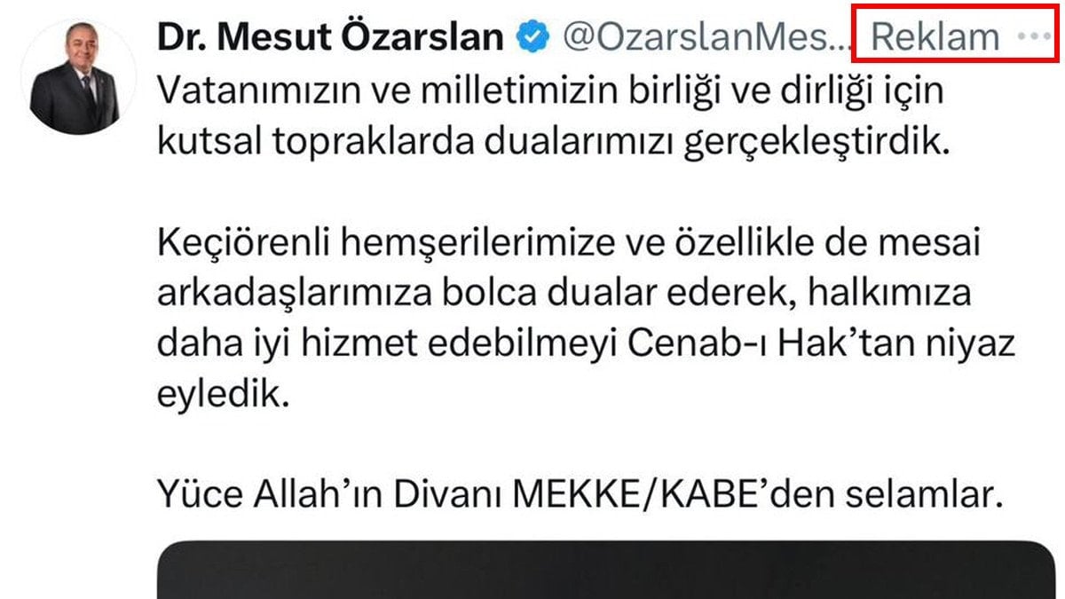 Başkan Özarslan’ın kutsal topraklara yaptığı ziyarete ilişkin paylaşımına reklam vermeyi de ihmal etmedi.