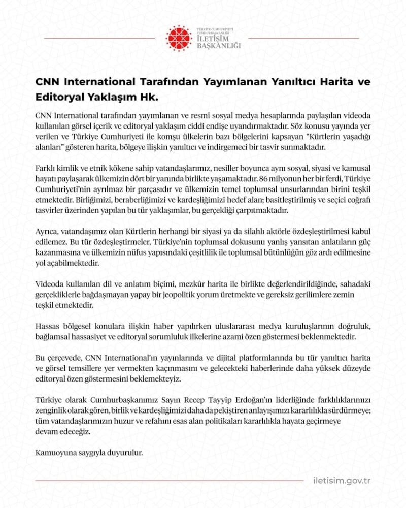 “CNN International tarafından yayımlanan sözde harita ve editoryal yaklaşım, Türkiye’ye ve bölgenin toplumsal gerçekliğine ilişkin yanıltıcı bir çerçeve sunmaktadır. Bu tür tasvirler, bölgedeki toplumsal çeşitliliği ve birlikte yaşama kültürünü göz ardı etmekte; kamuoyunun yanlış yönlendirilmesine yol açabilecek nitelik taşımaktadır.”