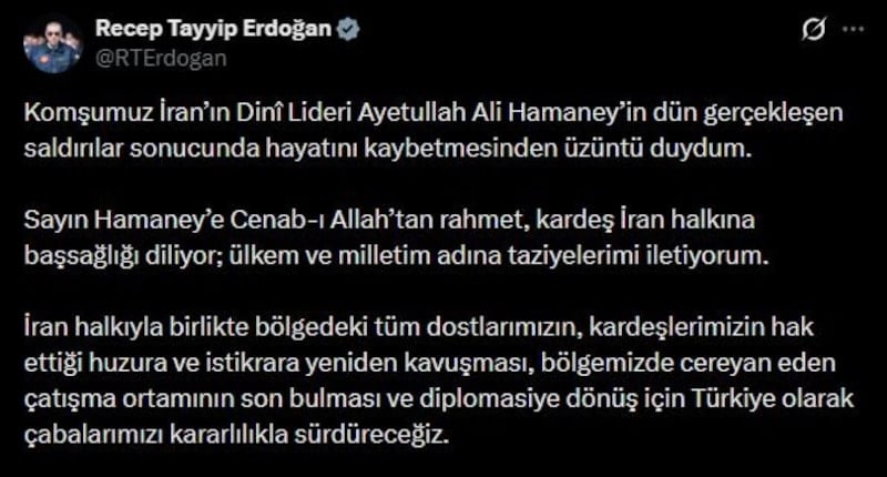 Cumhurbaşkanı Recep Tayyip Erdoğan, Ali Hamaney’in hayatını kaybetmesi üzerine sosyal medya platformu X üzerinden bir taziye mesajı yayımladı.