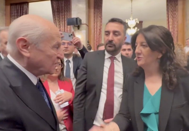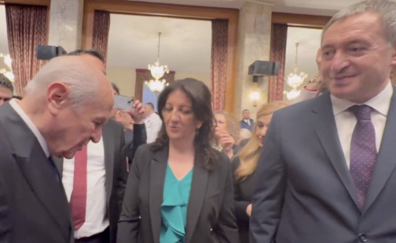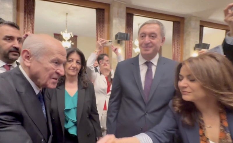 Bahçeli, Dem Parti eş Genel Başkanı Tuncer Bakırhan ve İmralı Heyeti üyesi Pervin Buldan ile selamlaştı.