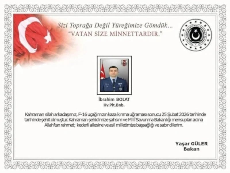 Milli Savunma Bakanlığı 9’uncu Ana Jet Üs Komutanlığı-Balıkesir’den kalkış yapan F-16 uçağının kaza kırıma uğraması sonucu Hava Pilot Binbaşı İbrahim Bolat şehit olmuştur.