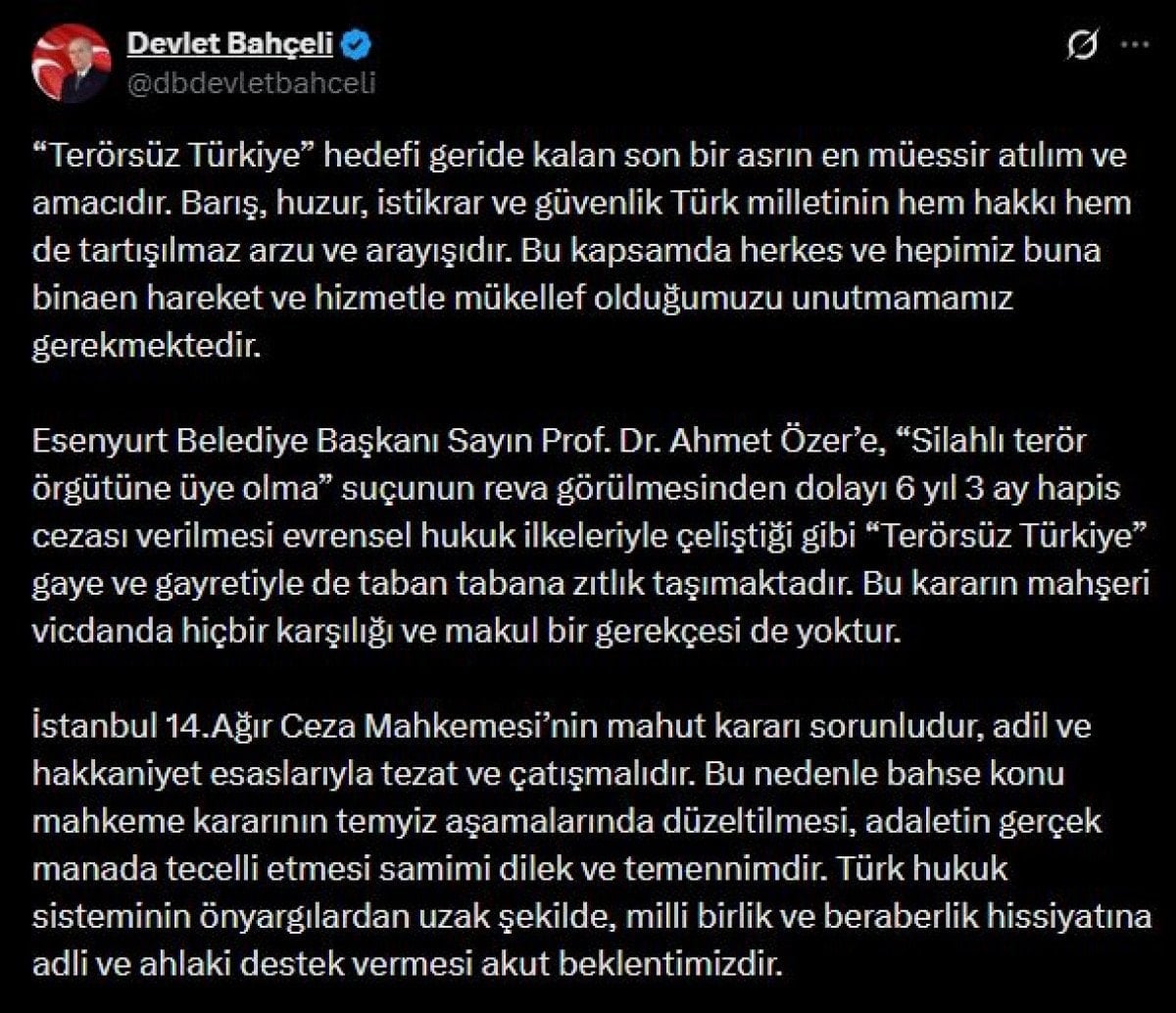Mahkemenin verdiği 6 yıl 3 ay hapis cezasını eleştiren Bahçeli, kararın evrensel hukuk ilkeleriyle çeliştiğini ve “Terörsüz Türkiye” hedefiyle taban tabana zıt olduğunu savundu.