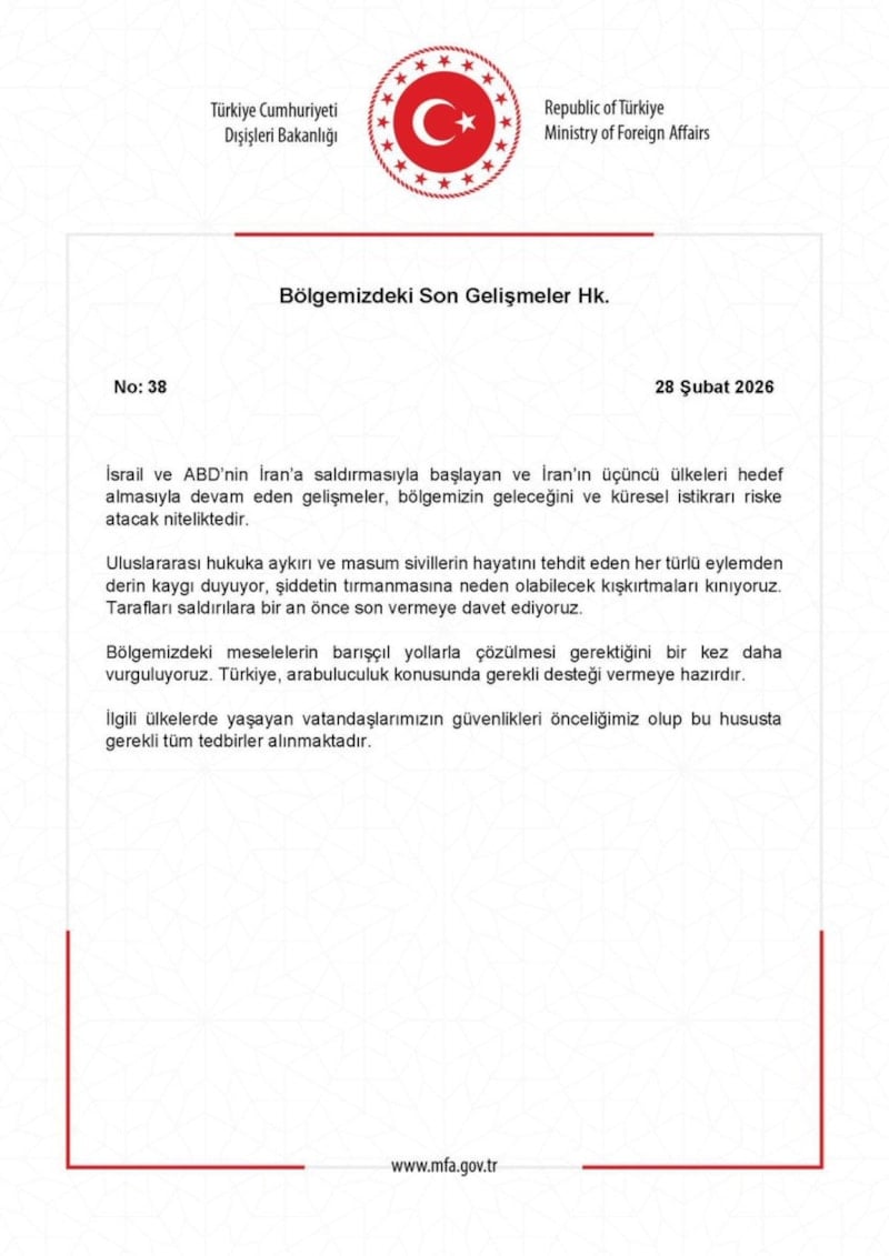 İsrail ve ABD’nin İran’a saldırmasıyla başlayan ve İran’ın üçüncü ülkeleri hedef almasıyla devam eden gelişmeler, bölgemizin geleceğini ve küresel istikrarı riske atacak niteliktedir.