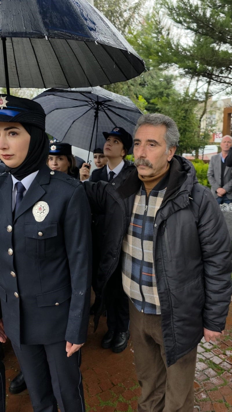 Emniyet mensupları ve vatandaşlar tören alanında toplanırken, sağanak yağmur başladı.