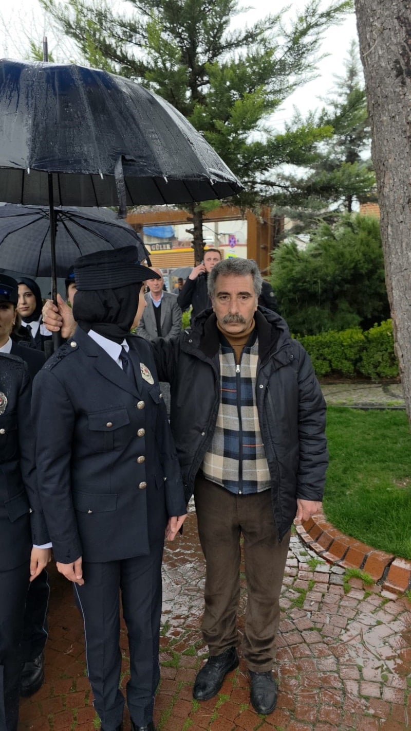 Emniyet mensupları ve vatandaşlar tören alanında toplanırken, sağanak yağmur başladı.