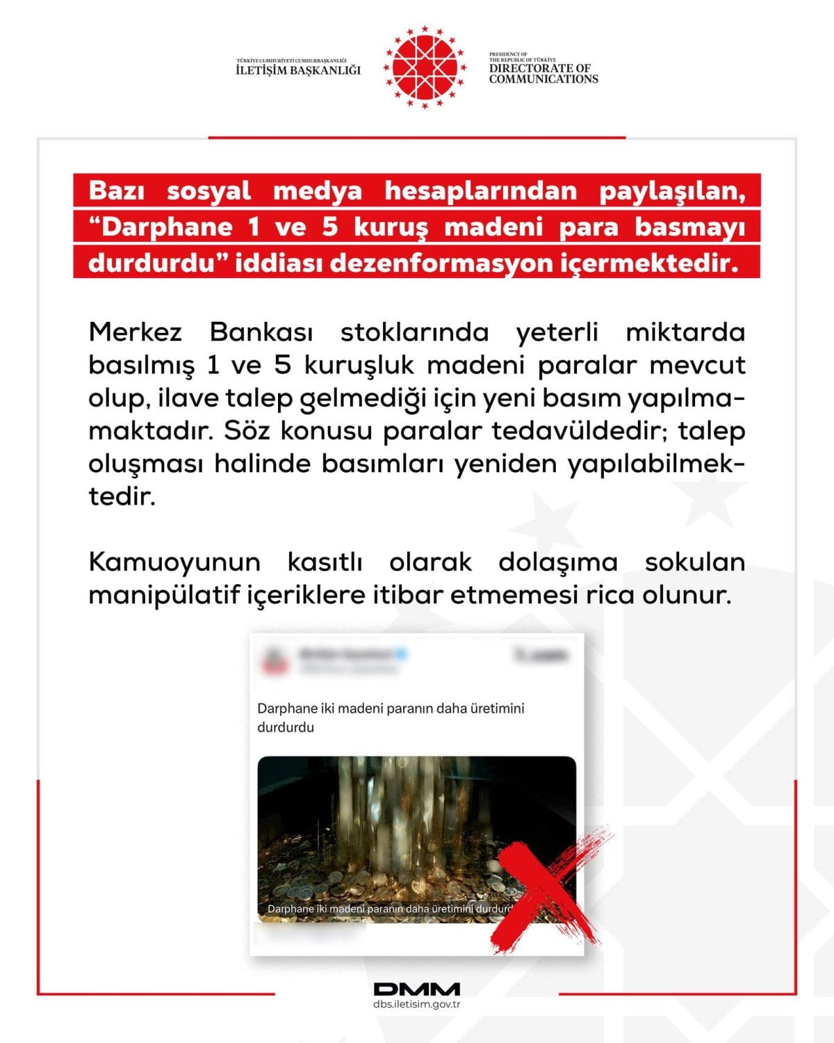 “Bazı sosyal medya hesaplarından paylaşılan, ‘Darphane 1 ve 5 kuruş madeni para basmayı durdurdu’ iddiası dezenformasyon içermektedir.