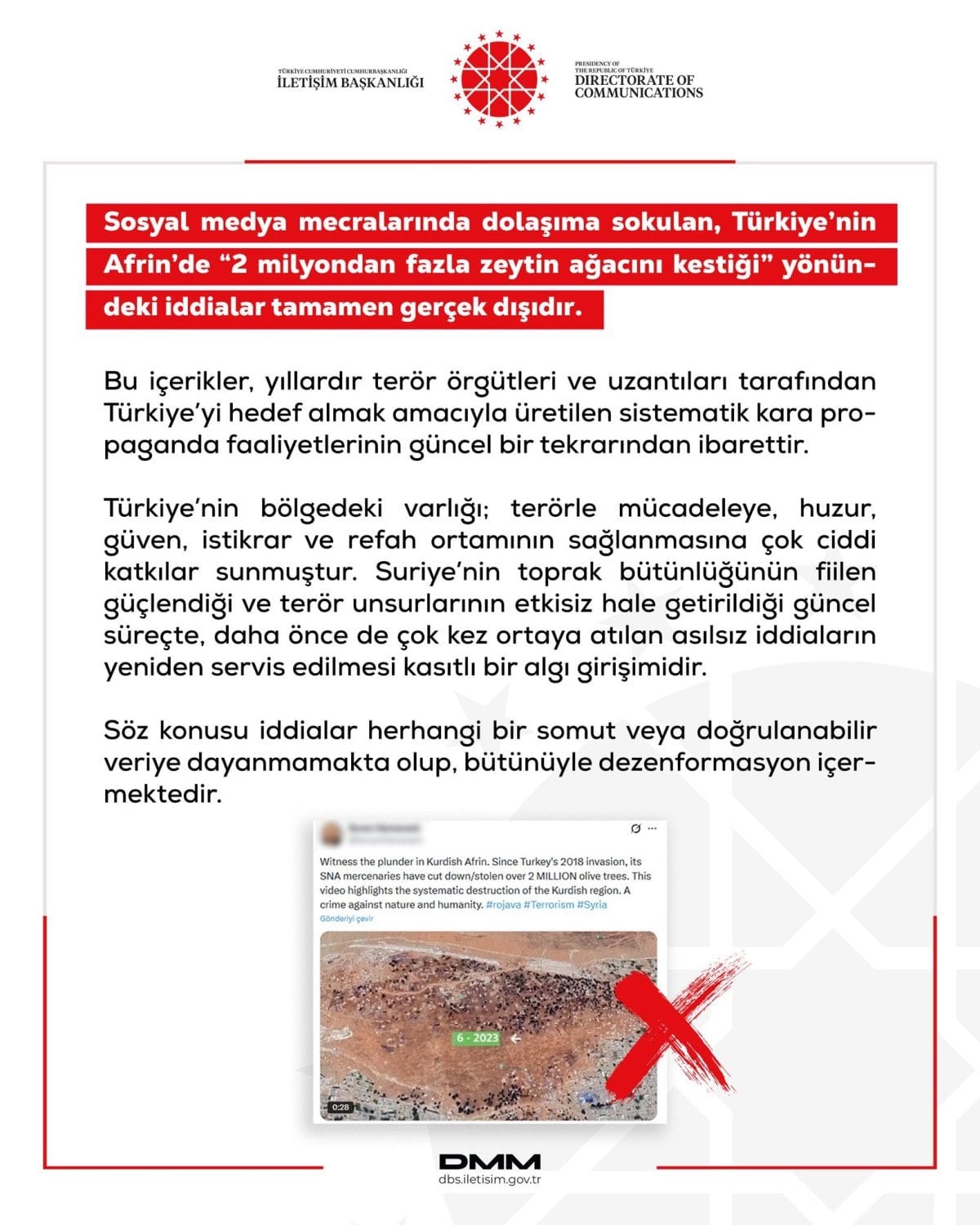 DMM tarafından sosyal medya hesabından yapılan açıklamada, sosyal medya platformlarında dolaşıma sokulan ve Türkiye’nin Afrin’de “2 milyondan fazla zeytin ağacını kestiği” yönündeki iddiaların gerçeği yansıtmadığı belirtildi.