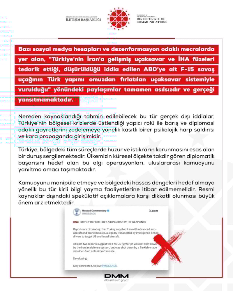 Cumhurbaşkanlığı İletişim Başkanlığı Dezenformasyonla Mücadele Merkezi, sosyal medya hesabından yapılan açıklamada, bazı sosyal medya hesapları ve dezenformasyon odaklı mecralarda “Türkiye’nin İran’a gelişmiş uçaksavar ve İHA füzeleri tedarik ettiği, düşürüldüğü iddia edilen ABD’ye ait F-15 savaş uçağının Türk yapımı omuzdan fırlatılan uçaksavar sistemiyle vurulduğu” yönündeki paylaşımların yer aldığı belirtildi.