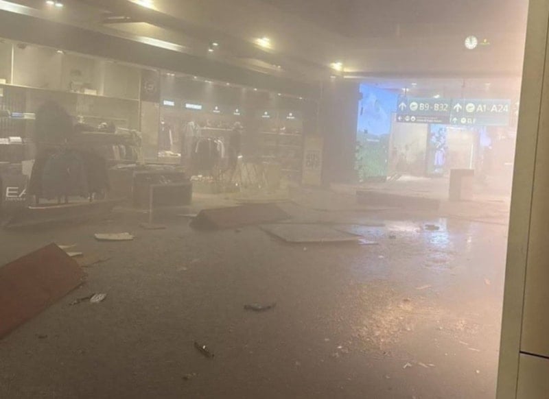 Olay yerinden gelen görüntülerde terminalin içinin yoğun toz ve dumanla kaplandığı, zemine cam kırıkları, tavan panelleri ve molozlar saçılmış olarak görülüyor.