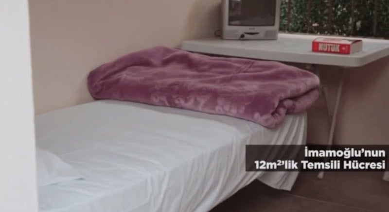 Sergilenen alanda, İmamoğlu’nun kaldığı hücreye benzer şekilde düzenlenen yaşam alanı yer aldı.
