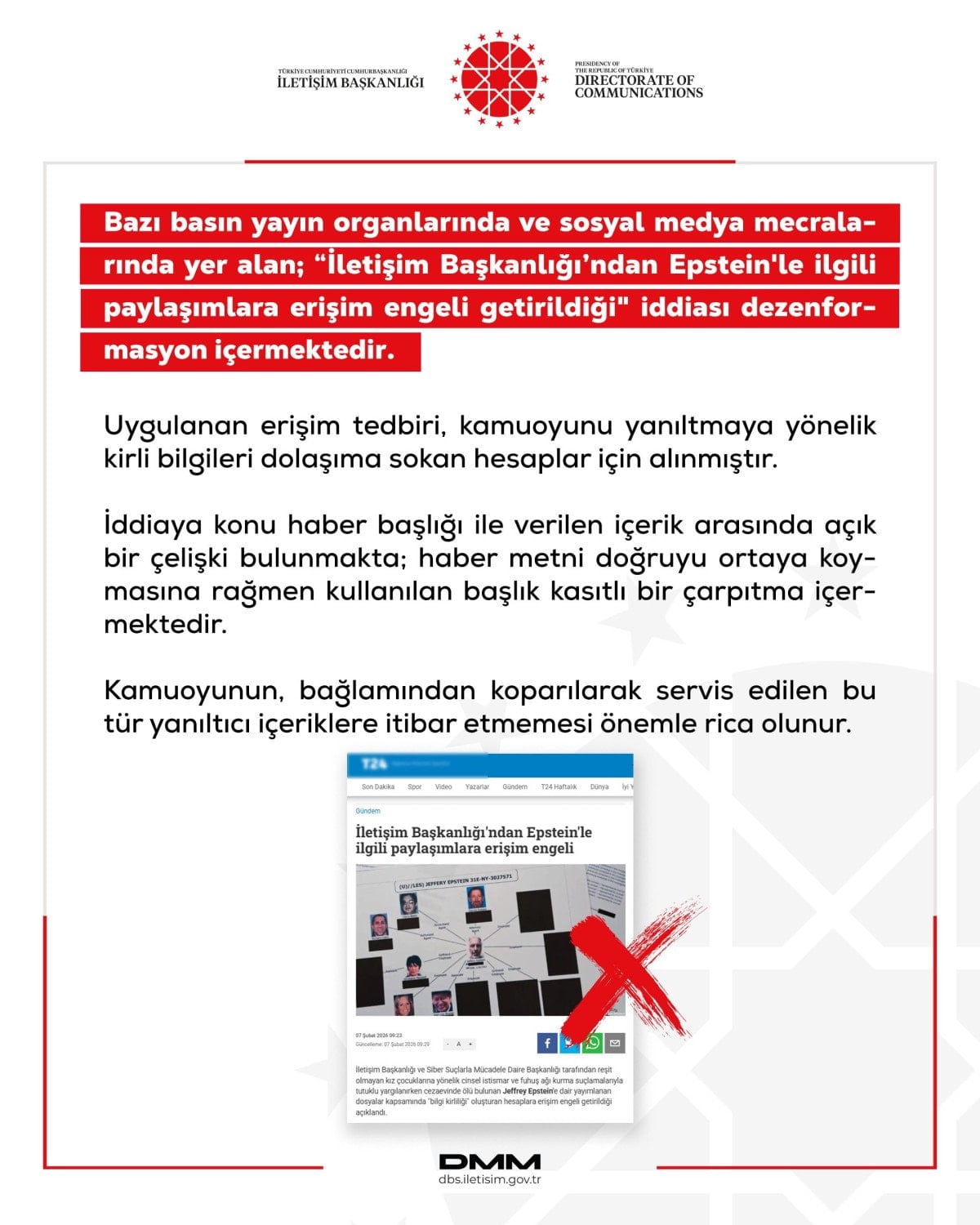 Bazı basın yayın organlarında ve sosyal medya mecralarında yer alan ‘İletişim Başkanlığından Epstein’le ilgili paylaşımlara erişim engeli getirildiği’ iddiası dezenformasyon içermektedir.