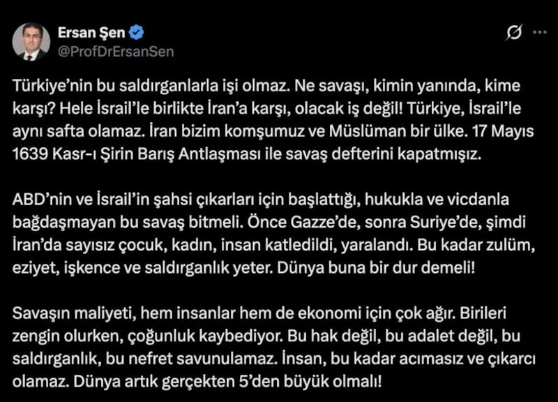 Türkiye’nin İran’a karşı savaşa gireceği iddialarına yanıt veren Şen, “Türkiye’nin bu saldırganlarla işi olmaz. Ne savaşı, kimin yanında, kime karşı?