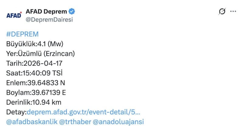 Afet ve Acil Durum Yönetimi Başkanlığı’ndan (AFAD) yapılan açıklamaya göre, merkez üssü Üzümlü ilçesi olan deprem 4.1 büyüklüğünde deprem meydana geldi.