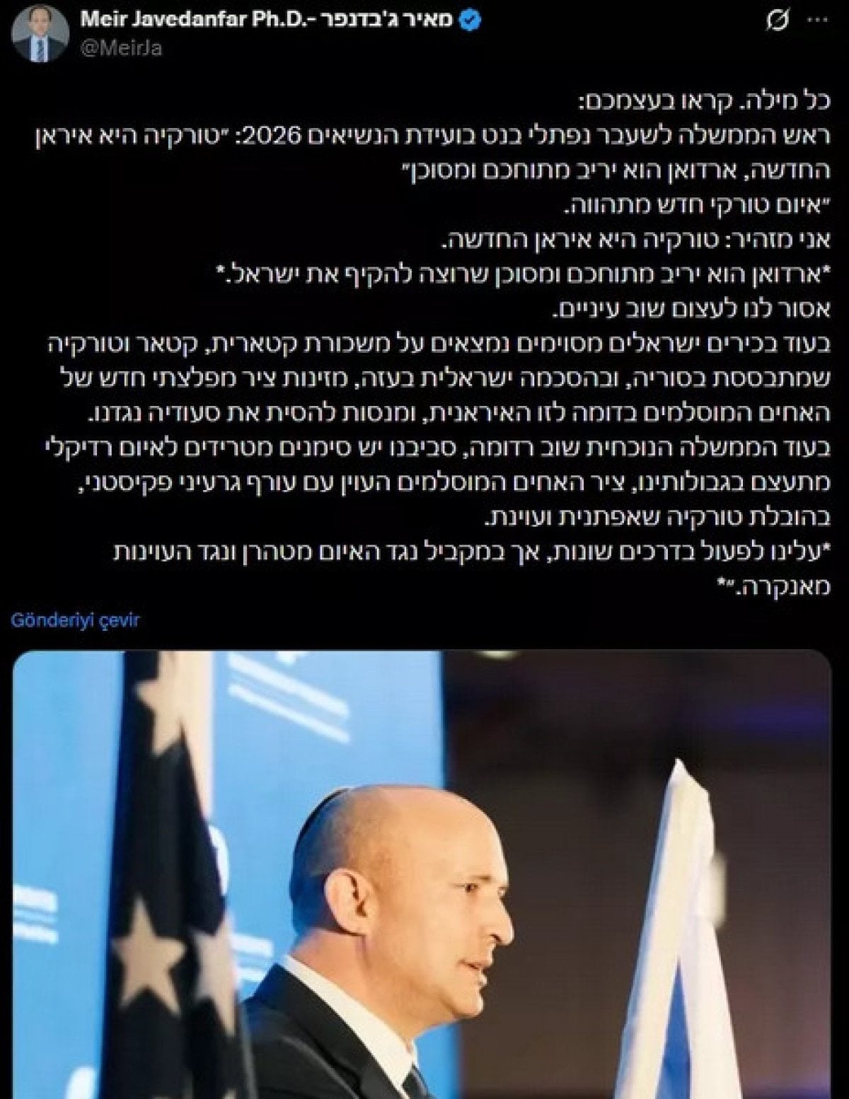 Eski İsrail Başbakanı Naftali Bennett, sosyal medya platformu X üzerinden İran uzmanı Dr. Meir Javedanfar’ın paylaşımını alıntılayarak Türkiye ve Cumhurbaşkanı Recep Tayyip Erdoğan hakkında açıklamalarda bulundu.
