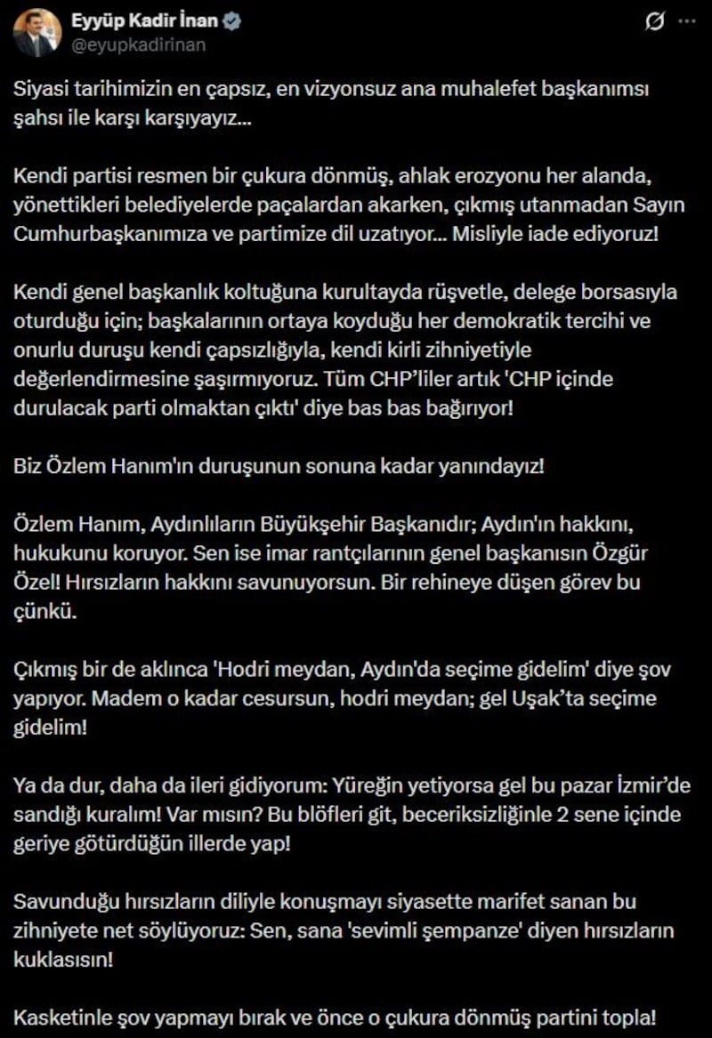 AK Parti Genel Sekreteri ve İzmir Milletvekili Eyyüp Kadir İnan, sosyal medya hesabından yaptığı açıklamada CHP Genel Başkanı Özgür Özel’i hedef aldı.