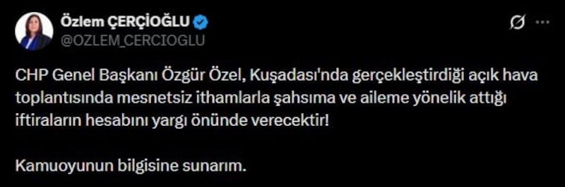 Aydın Büyükşehir Belediye Başkanı Özlem Çerçioğlu da sosyal medya hesabından yaptığı açıklamada, Özel’in Kuşadası’ndaki konuşmasında kendisi ve ailesine yönelik “mesnetsiz ithamlarda bulunduğunu” belirterek, “Atılan iftiraların hesabı yargı önünde sorulacaktır” dedi.