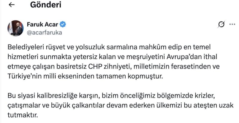AK Parti Genel Başkan Yardımcısı ve Tanıtım ve Medya Başkanı Faruk Acar ise sosyal medya hesabından yaptığı paylaşımda, CHP’nin milletin ekseninden yoksun olduğunu söyledi.