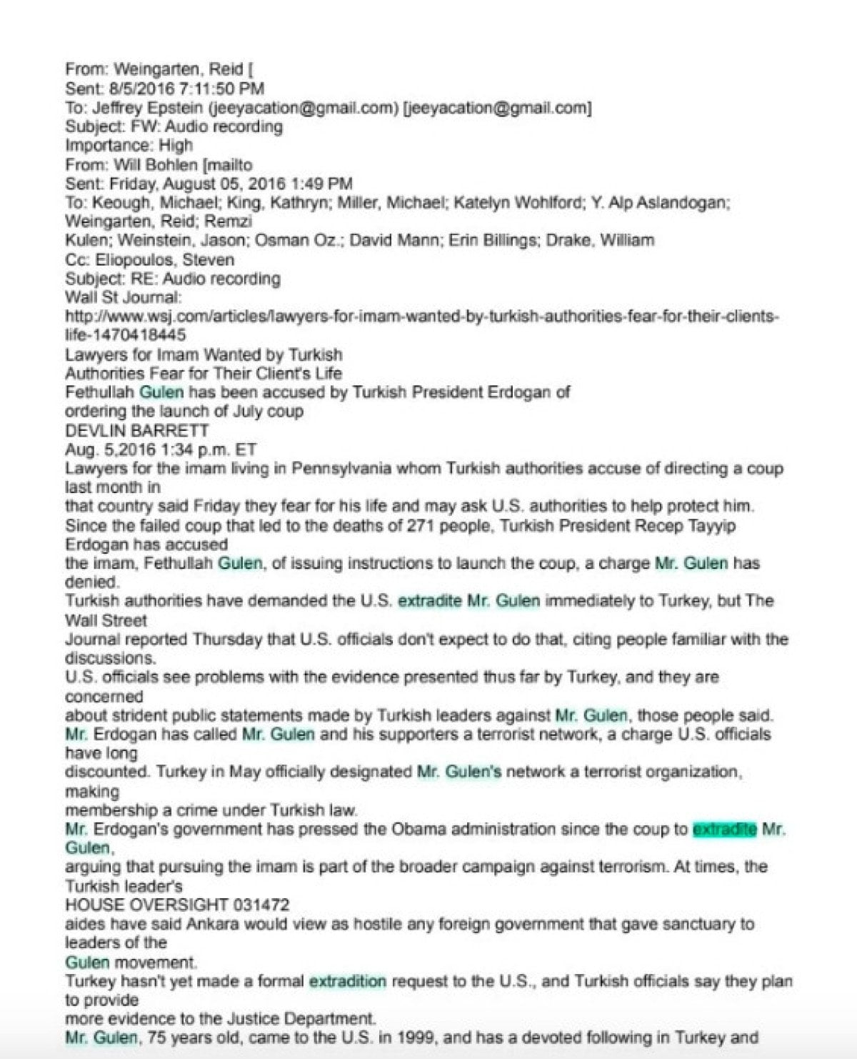 Epstein’e “Önem derecesi yüksek” notuyla atılan e-postaya Weingarten’in FETÖ’nün ABD’deki yöneticilerinden Yüksel Alp Aslandoğan’ı da eklediği görüldü.